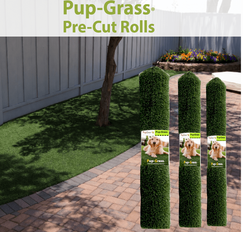 Are the perfect ready-to-install solution for small areas, patios, porches, dog runs,Backyard-landscape-dog-potty-grass-using- and indoor/outdoor potty zones. Each roll includes the same instantly-draining, odor-resistant,  PFOA-free, lead-safe Pup-Grass® surface trusted for over 20 years.  These convenient, lightweight 3-foot-wide rolls are easy to carry, trim, and install—ideal for renters, small spaces, and quick projects.