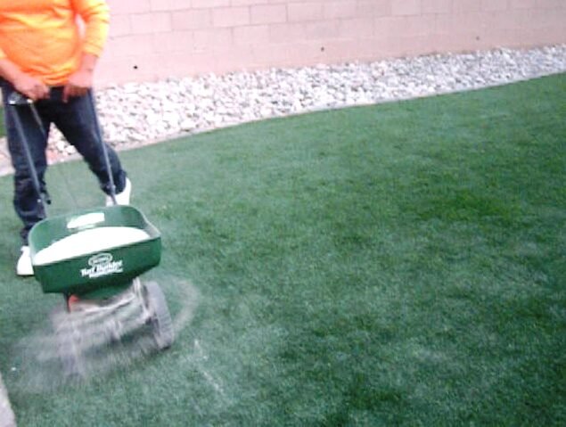 As you work, continuously check for any wrinkles or air pockets. If you find any, lift the turf slightly in that area and use the kicker to stretch it again before securing it. Be sure to apply even pressure with the kicker to avoid overstretching certain sections, which could cause uneven tension or even tear the turf.e recommend only one type of infill for dogs and that is 100% Pure Zeolite. The fastest way to apply it is using a fertilizer spreader use enough infill to fill the area from the backing to ¾ of the way up the blade. You can also pour little mounds 4’-5’ apart and use a leaf blower to spread and the infill. We recommend using ¼ lb of infill per sq ft . Once to finish take a hose and clean the dust off the Pup-Grass.